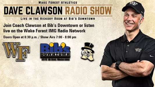 WINSTON-SALEM, N.C. --The Dave Clawson Show is back on the air this Wednesday, Dec. 14, from 7-8 p.m. on the Wake Forest IMG Sports Network. The show will be live on location at Bib's Downtown in Winston-Salem.