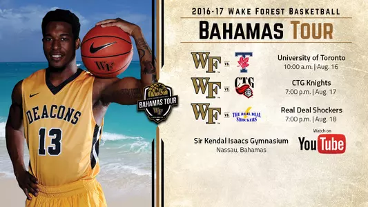 The Deacs open play in the Bahamas on Tuesday, Aug. 16, as they play the University of Toronto at 10 a.m. The next two days they will play Bahamian club teams, CTG Knights on Wednesday, Aug. 17 at 7 p.m., and The Real Deal Shockers on Thursday, Aug. 18 at 7 p.m. All three games will have live stats and a live video stream on YouTube.The games are part of the annual BTC Summer of Thunder exhibition series at the Sir Kendal Isaacs Gymnasium. The event runs throughout August and matches collegiate teams against teams from the Bahamas. Other schools competing in this year's event include UNLV, Central Michigan, Wyoming, Florida Gulf Coast and Missouri State, but NCAA schools are only permitted to play exhibition games against non-NCAA competition while overseas.