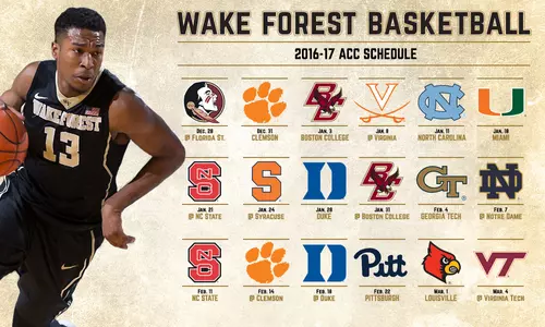 The Demon Deacons' home ACC schedule includes visits by Clemson (Dec. 31), Boston College (Jan. 3), North Carolina (Jan. 11), Miami (Jan. 18), Duke (Jan. 28), Georgia Tech (Feb. 4), NC State (Feb. 11), Pitt (Feb. 22) and Louisville (Mar. 1).