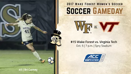 • No. 15 Wake Forest returns home to Spry Stadium to face Virginia Tech on Thursday, Oct. 5 at 7 p.m. The match will be broadcast on ACC Network Extra.