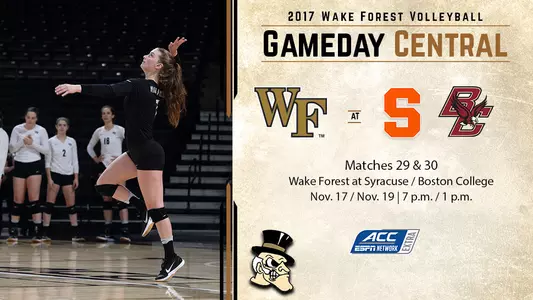 - Wake Forest will make its final road trip of the season, beginning with a 7 p.m. match at Syracuse on Friday, Nov. 17.