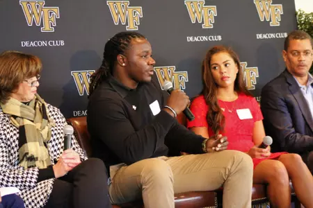 After completing his own remarks, Riley went on to moderate a panel discussion about the student-athlete experience at Wake Forest. Panelists included women's golfer, Sierra Sims ('17); former football and basketball player, Bill Robinson ('87, P '17); football player, Wendell Dunn ('17); and scholarship donor and Deacon Club Board of Directors member, Rhona Sherrill.