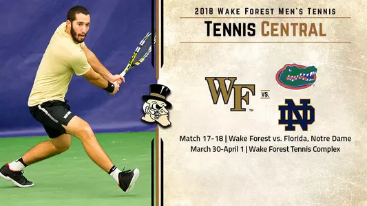 • The No. 1 Wake Forest men's tennis team returns home for a pair of ranked matches, playing host to No. 10 Florida on Friday (March 30) and No. 25 Notre Dame on Sunday (April 1) at the Wake Forest Tennis Complex.