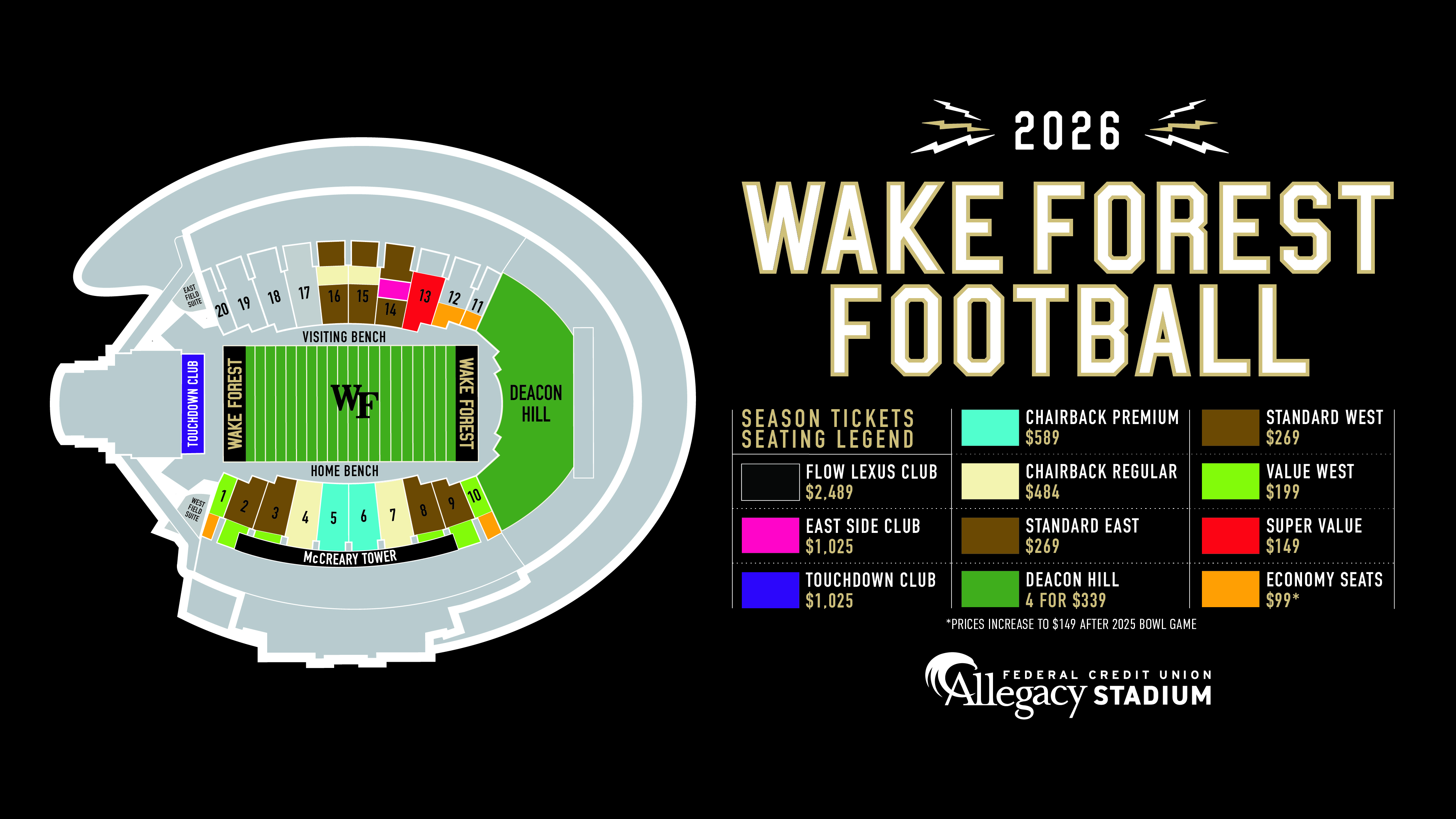 WINSTON-SALEM, N.C. – Wake Forest Athletics announced today the availability of football season tickets, in conjunction with the increasingly popular Annual Seat Rights Program for the 2026 Demon Deacon Football season at Allegacy Federal Credit Union Stadium, providing fans with expanded flexibility and the assurance of keeping their same seating location year after year.